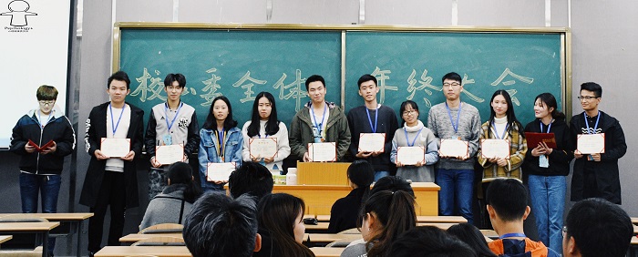 大会第四项:优秀干事表彰大会。四个部门经过精心的筛选,各选出三名在这半年工作中表现较为突出的干事,由指导老师们颁发优秀干事奖状。