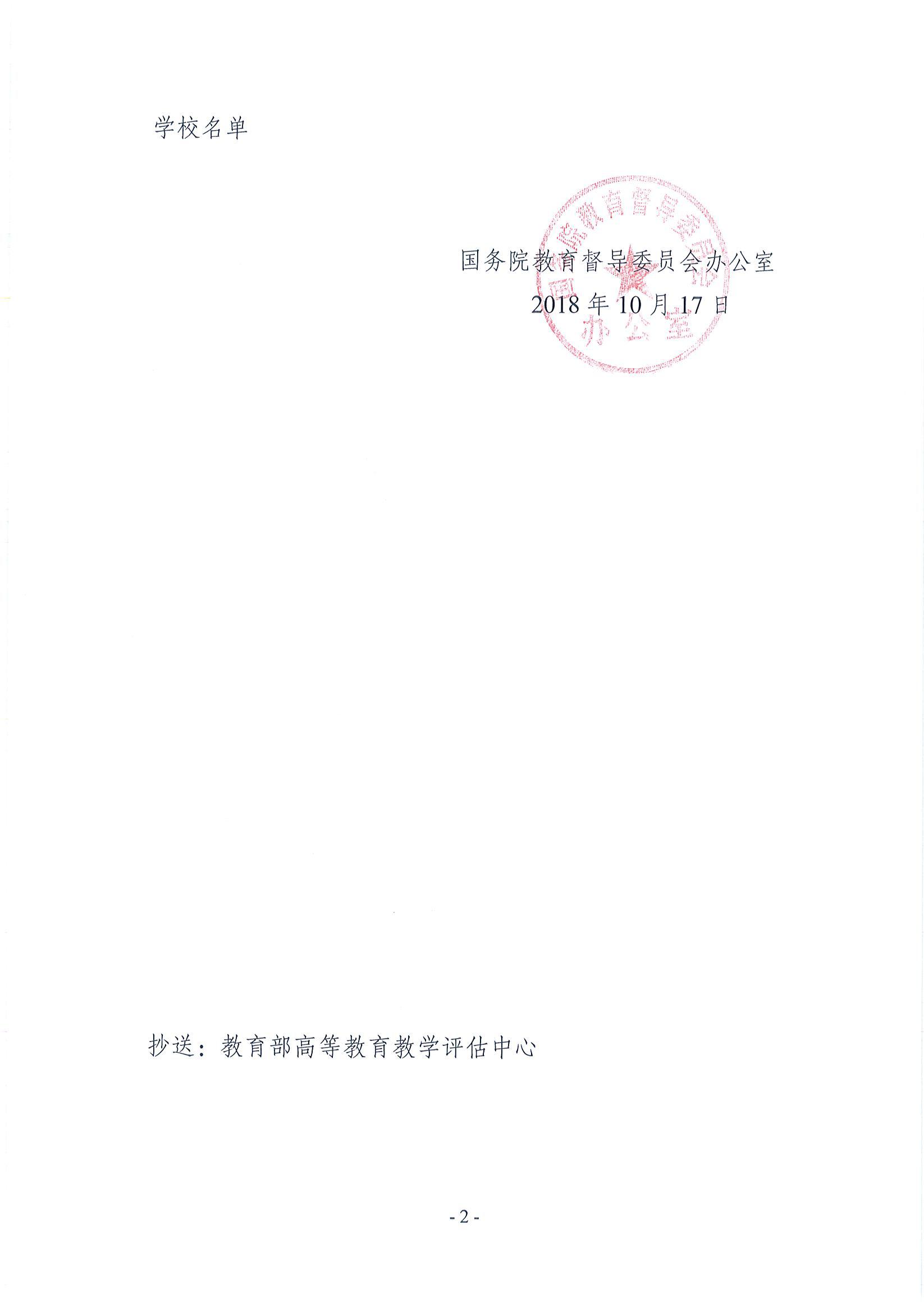 2018年10月17日,国务院教育督导委员会办公室下发了《国务院教育督导委员会办公室关于确定2019年普通高等学校本科教学工作合格评估参评学校的通知》(国教督办函〔2018〕84号),公布了2019年全国普通高等学校本科教学工作合格评估工作计划,其中我校被确定为2019年普通高等学校本科教学工作合格评估参评学校。