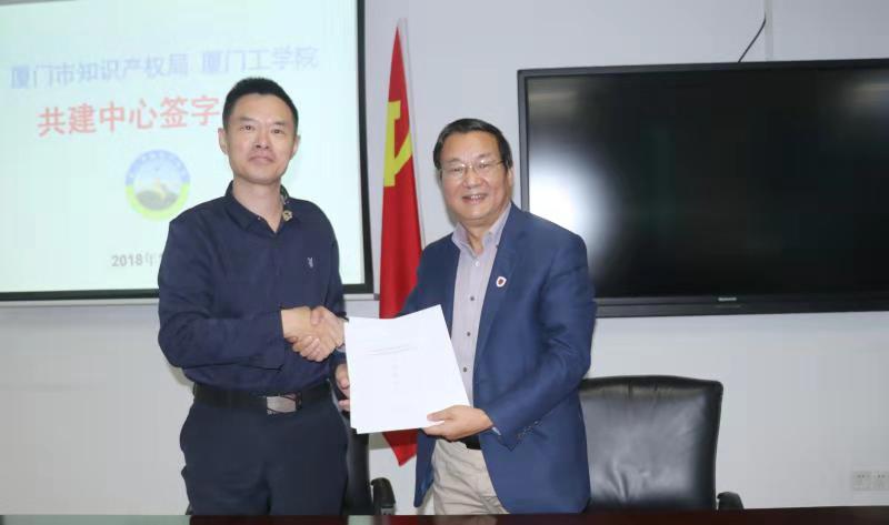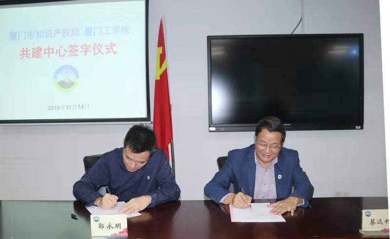 我校蔡远利校长和厦门市知识产权局郭永明副局长在合作协议上正式签约。出席签约仪式的还有厦门知识产权局法律事务处处长陈黎明、法律事务处主任科员王振玲、我校创客坊梁宏主任、宣传处副处长顾留章、科研处处长助理吴琳琳。