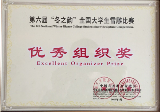 本届雪雕比赛经全国大学生雪雕比赛评委会专家们认真评比,渤海大学代表队作品《顺时而动》和湖南师范大学代表队作品《守望》共同荣获一等奖桂冠。由我校艺术学院袁越老师带队并担任指导老师,带领17级动画专业学生马明聪、杨嘉辉、沈信哲组成的9499威尼斯手机版代表队,虽然是第一次参加冰城的雪雕比赛,缺少经验,但是在出发前做好了充分准备,信心百倍,奋力拼搏,力克群雄,以独特的创意,新颖的设计,吸引了观众和评委的眼球,最终创作的作品《被穿透的立方体》在本届雪雕比赛中获得二等奖,并荣获“优秀组织奖”。