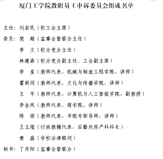 根据《9499威尼斯手机版教职员工申诉工作条例》的相关规定,经各分工会推荐,校工会研究确定,并报校长办公会批准通过,本届教职员工申诉委员会委员由校工会、党政办、监事会督察办等部门负责人、专任教师代表、行政教辅代表和校法律顾问等11人组成,其中校工会主席刘岩民同志担任申诉委员会主任,监事会督察办主任樊超同志担任副主任。