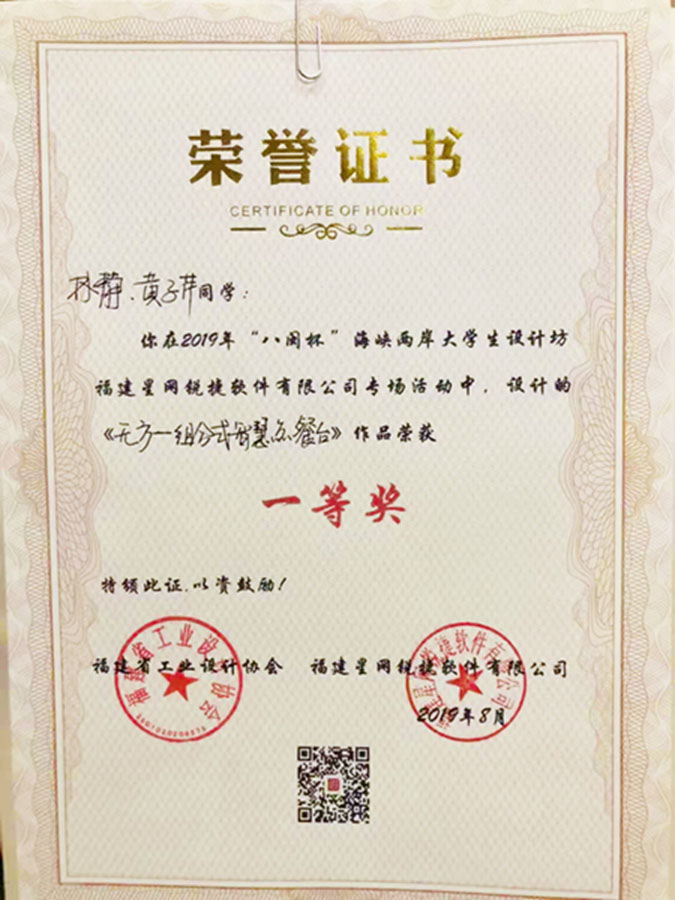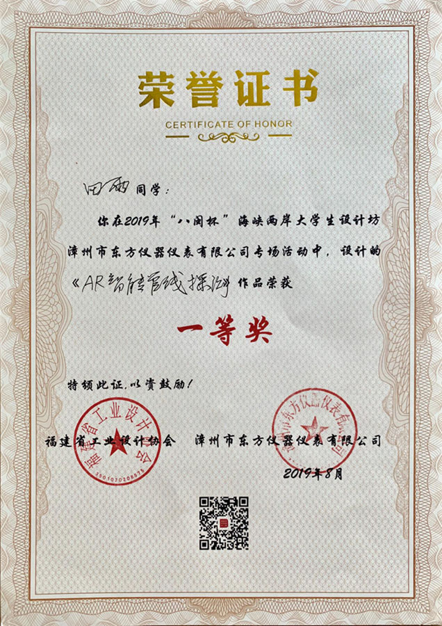 8月17日,2019年“八闽杯”海峡两岸大学生设计坊在经过紧张的20天入住福建知名企业高强度训练与设计比拼,终于落下帷幕。由我校艺术学院孔月光老师、张楚楚老师指导下,艺术设计系16级动画专业田雨同学、17级动画专业林静同学代表9499威尼斯手机版成功通过全国初选,参与此次设计坊与设计竞赛。虽然是我系学子是第一次参加面向全国大学生的省级产品设计坊和竞赛,但在平时的产品专项训练教学中已做好充分的准备,以独特的创意和设计巧思,赢得了专业评委和企业的好评,最终设计作品《AR智能管线探测》、《无方—组合式智慧点餐台》分别获得东方仪器仪表有限公司专场、福建省星网锐捷软件有限公司专场的一等奖。