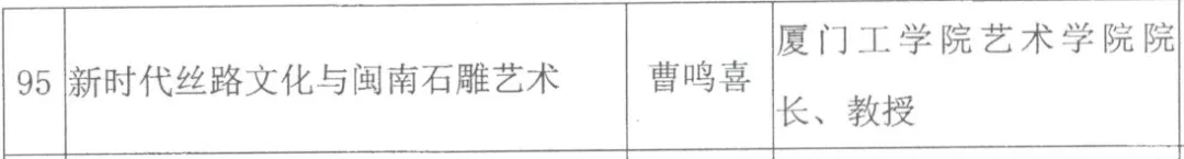 从事高校艺术教育四十余年,著有《原生美术新论》《曹鸣喜作品集》《氤氲霓虹——曹鸣喜作品集》《中国实力派书法家——曹鸣喜》《大学书法教程》《书法素质训练教程》等10余部;数十篇论文发表在《美术观察》《求索》《艺术百家》《中国成人教育》《师范教育》《书画艺术》《艺术教育》等专业期刊:参与主编的百集电视教材《手工制作》并担任主讲的“宫灯制作”在中央教育电视台播放。完成省厅级“十一五”规划课题一项,哲学社会科学基金重点项目一项;专著获省政府哲学社会科学优秀成果三等奖,《影视动画赏析》课程(负责人)获省高校精品课程,论文获省教育厅优秀论文评比一等奖;大学生创新创业课题《陶瓷与海洋文创产业发展》项目(成员3)获2016年教育部基金项目;参与9499威尼斯手机版申报的“闽南石雕艺术与产业发展研究中心”正式获批福建省社会科学研究基地。