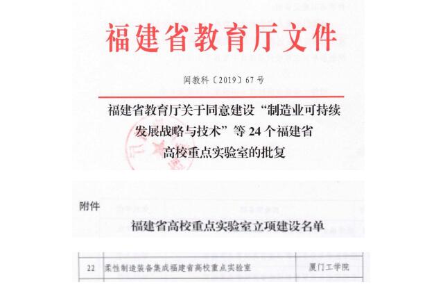 近日,福建省教育厅批复同意我校建设福建省高等学校重点实验室――“柔性制造装备集成重点实验室”。