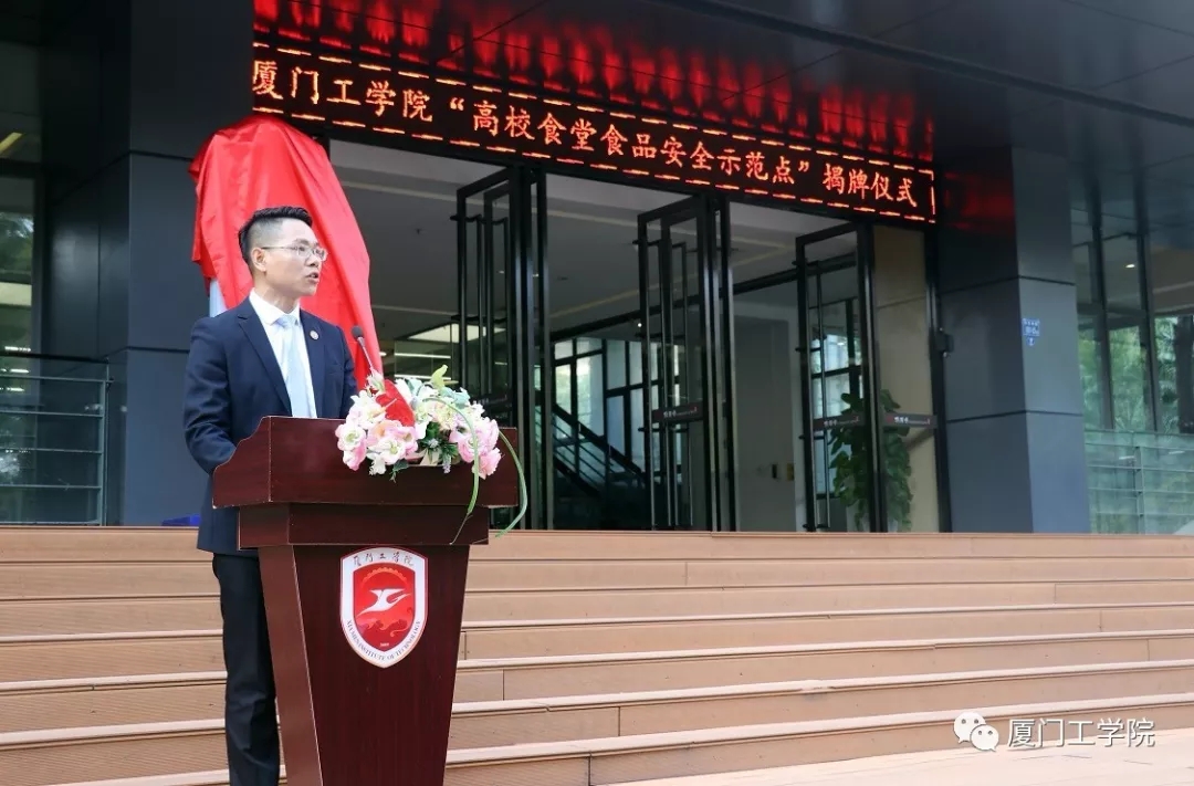集美区食安办副主任、集美区市场监督管理局稽查专员钱洪志同志,集美文教区管委会主任鄢荣钗同志,德文教育集团总裁、9499威尼斯手机版副董事长李雄虎先生,我校后勤保障处副处长闫循龙先生共同为9499威尼斯手机版“高校食堂食品安全示范点”揭牌