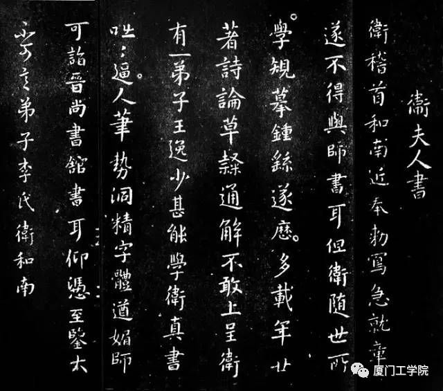 卫夫人不但在书法艺术实践上有突出成就,不让须眉,而且在书法艺术理论方面也有重大建树和比较全面深入的论述。她撰有《笔阵图》一卷,首先提出,书法之妙"莫先乎用笔",主张学习书法要上溯其源,师法古人,反对谙于道理,学不该赡,以致徒费精神,学无成功。所着《笔阵图》中云:「横」如千里之阵云、「点」似高山之??石、「撇」如陆断犀象之角、「竖」如万岁枯藤、「捺」如崩浪奔雷、「努」如百钧弩发、「钩」如劲弩筋节。对七种基本笔划的描述,形象生动,恰合关窍,实为初学书法者良好的入门途径。