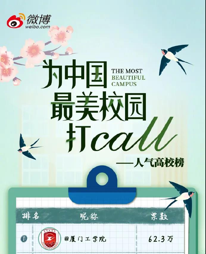 今日凌晨,2020#为中国最美校园打call#「人气高校榜」TOP10高校正式出炉。截至4月20日24:00,根据投票专题页前端总投票量排名,我校在“为中国最美校园打call”人气榜中位于榜首。