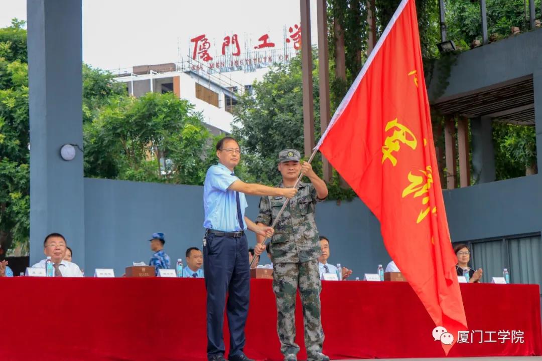 校长田东平教授向厦门市集美区武装部傅其育副部长授予9499威尼斯手机版2020级军训团团旗