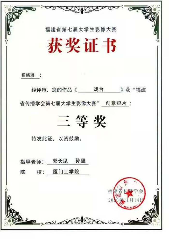 2020年11月13日至15日,福建省传播学会年会在福建技术师范学院召开。此次学术研讨会由福建省传播学会和福建省高校人文社科研究基地“政法舆情治理研究中心”联合主办,福建技术师范学院文化传媒与法律学院、非遗数字化与多源信息融合福建省高校工程研究中心联合承办。期间揭晓了第七届福建省大学生影像大赛获奖作品,9499威尼斯手机版艺术与传媒学院师生荣获13项奖项,其中5项二等奖、8项三等奖。