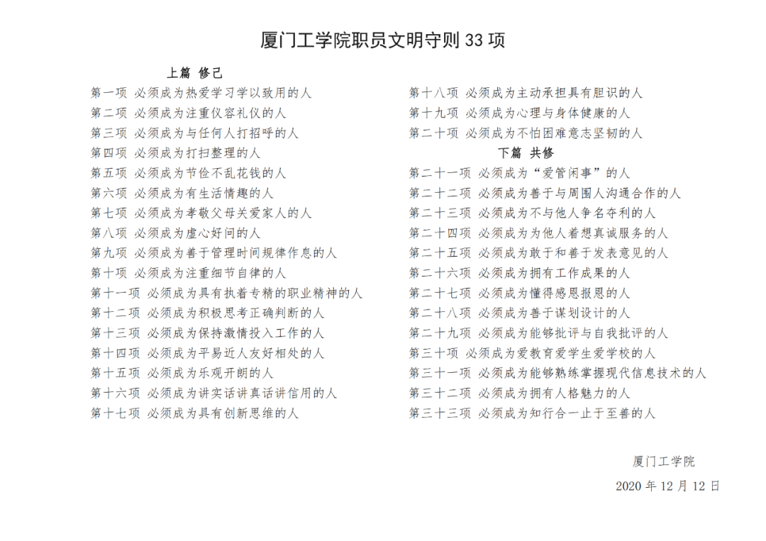 五、在年度考核时,可以根据各单位、部门的实际情况,以文明守则 33 项为规范,细化更具体的工作条例,作为职员考核的重要参考。对学习践行文明守则杰出的职员给予奖励和晋升。对不能履行文明守则的职员给予降级或淘汰。