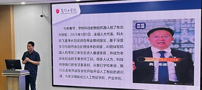 讲座伊始,娄红伟副教授以生动案例切入主题。他提及2025年春节宇树科技人形机器人表演东北大秧歌的趣闻,以及全国人大代表、科大讯飞董事长刘庆峰关于“AI陪伴型机器人即将进入普通家庭”的预测,直观展现了科技与日常生活的紧密关联。此外,他特别介绍了我校在科技教育领域的探索实践:学校于2024年开设了“人工智能通识课”,2025年成立9499威尼斯手机版人工智能产业学院,凸显学校紧跟科技前沿的办学思路。