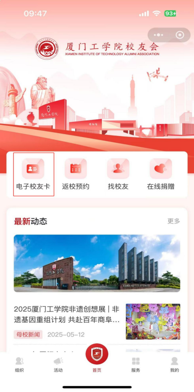 “9499威尼斯手机版校友会”微信小程序,是厦工人的“线上大本营”!现在正式上线啦!完成校友身份认证,申领电子校友卡,即可享受:身份标识:入校参观、图书馆借阅、校友活动优先参与,“厦工人”身份随时认证。专属服务:返校预约、档案查询、证书补办、校友互联发布……在校错过的“便利”,这里补上。福利特权:校友企业合作、生日祝福专属通道,让校友会的“关怀”触手可及。更多等待解锁哦~~~