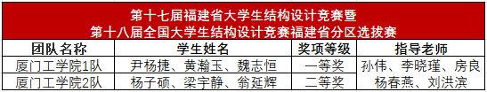 在第十七届福建省大学生结构设计竞赛暨第十八届全国大学生结构设计竞赛福建省分区选拔赛中,我校建筑科学与土木工程学院的两支代表队分获一等奖与二等奖,并获得参加全国大学生结构设计竞赛资格(全省仅4个名额)。具体名单如下: