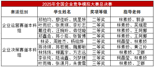 在2025年全国企业竞争模拟大赛总决赛中,我校商学院学生获二等奖6项,三等奖3项。具体名单如下:
