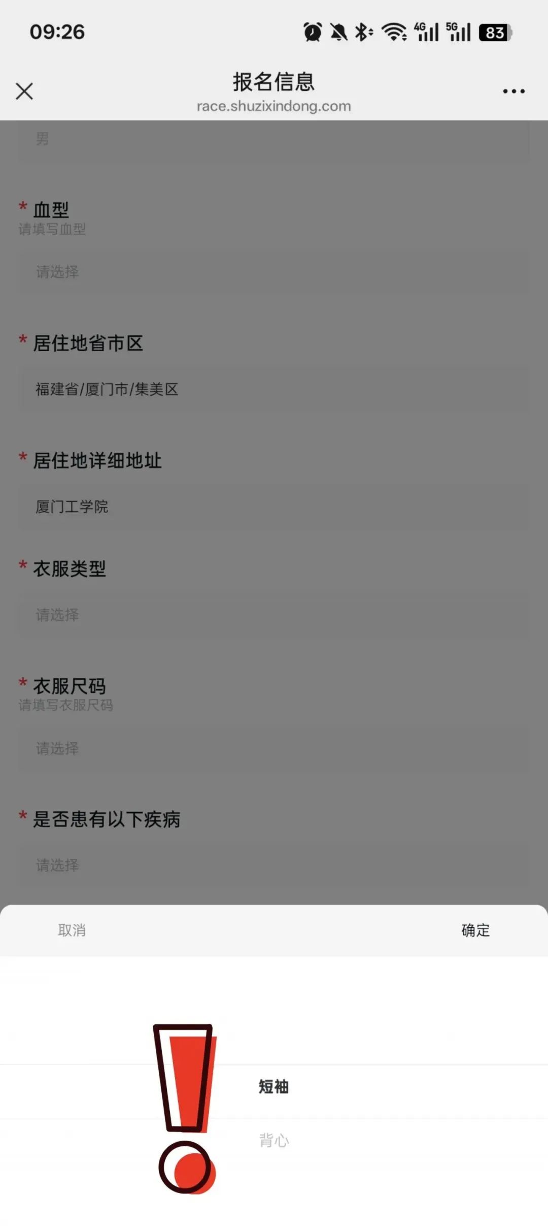 可在报名信息中选择衣服的类型和尺码