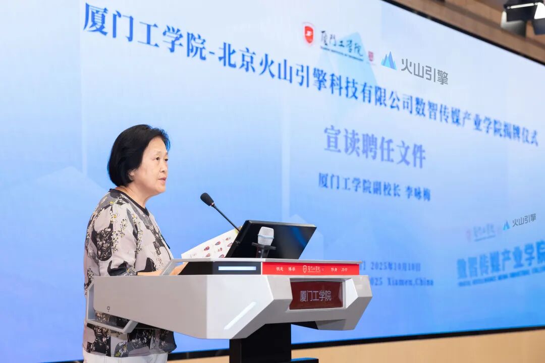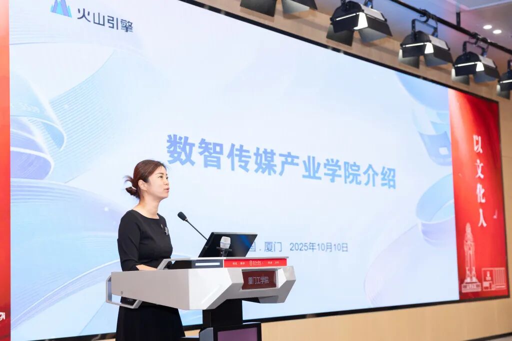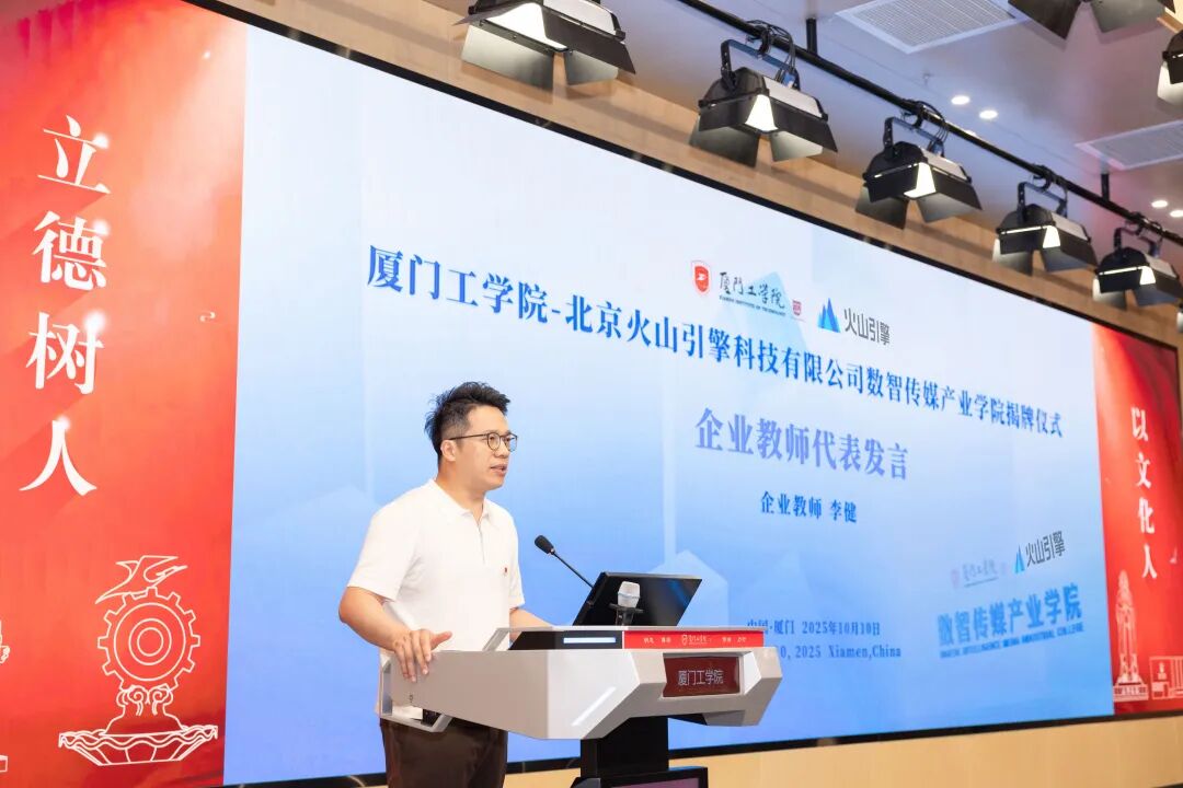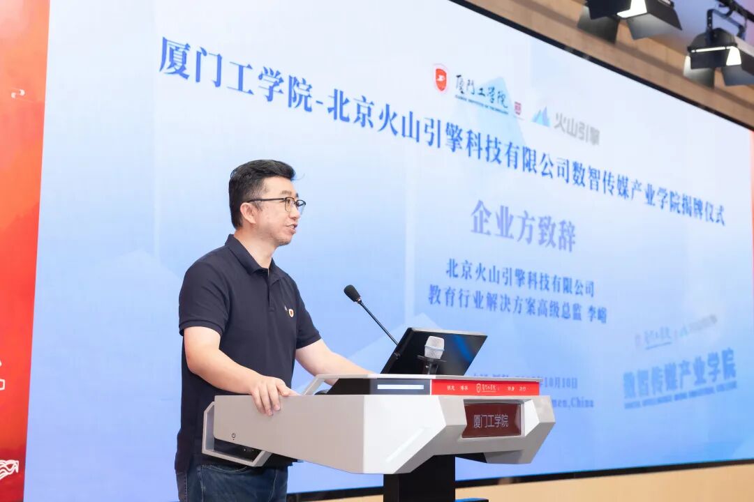 火山引擎高级总监李峪在致辞中指出传媒行业正处于快速变革期,数智技术的融入让传统媒体焕发出新的生机与活力,但与之相匹配的专业人才却存在较大缺口。此次与学校共建产业学院,正是看中了学校扎实的教育基础以及在传媒领域的深厚底蕴,希望通过双方优势互补,将企业的真实项目、先进技术、行业经验融入教学过程,让学生在校园内就能提前接触到实际工作场景,锤炼专业技能,未来能更好地融入行业,为推动整个数智传媒产业的高质量发展贡献力量。