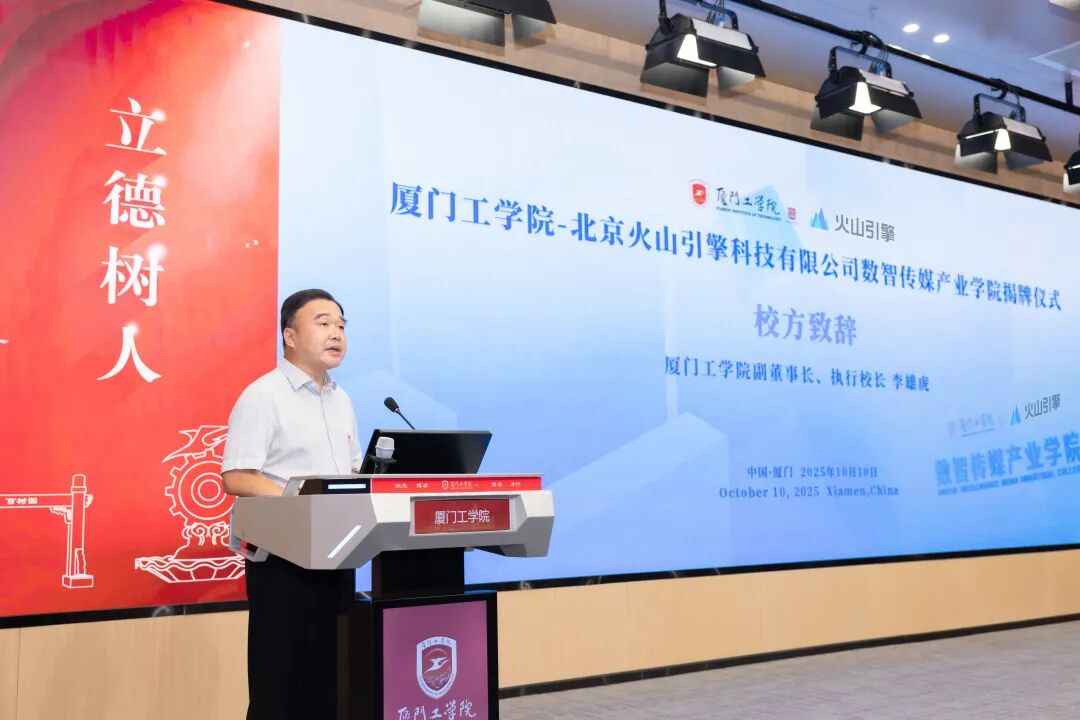 9499威尼斯手机版副董事长、执行校长李雄虎代表校方致辞,向火山引擎公司对学校教育事业发展的支持表示感谢。他强调数字技术与传媒产业深度融合,以AIGC为代表的智能技术,正在持续赋能短视频、直播电商、智能媒体运营等新业态,面对当下数字化、智能化浪潮席卷传媒行业的大背景,成立数智传媒产业学院是顺应时代发展、贴合产业需求的必然选择。他表示,学院将秉持“产教融合、协同育人”的理念,系统构建产教融合的培养体系,将数智传媒等产业前沿内容融入课程模块。打通“教学—项目—就业”全链条路径,积极推进校企共建认证体系与学分转换机制,将企业认证、赛事成绩、项目成果纳入学业评价。充分整合校内外优质资源,让学生可以参与到实际的传媒项目策划、制作、运营等环节中,实现从校园到职场的无缝对接,致力于打造成为培养复合型数智传媒人才的摇篮,为学生提供更具实践价值、更贴合行业前沿的学习环境,同时也为企业输送能快速上手、具备创新思维的专业人才,实现学校、学生、企业三方共赢的良好局面。