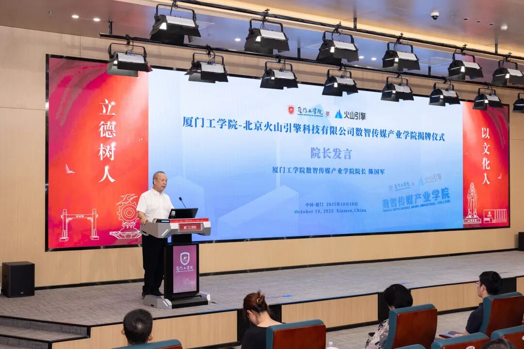 数智传媒产业学院院长陈国军在发言中表示,数智传媒产业学院将从“培养模式-专业建设-师资团队-实践平台”四个维度,优化提升,实施深度价值赋能。依托抖音电商理念,结合技术趋势与岗位需求,助力课程体系建设。聚焦数智传播岗位需求,构建“技术+平台+素养”专业框架,培养面向厦门相关产业、基于新媒体平台的“一专多链”人才。通过多种方式培养产教教师,引入企业师资,建设专兼职队伍,打造复合师资队伍。联合开发课程,推进实战项目,依据智能传播生产环境,建设产教融合实践实训基地,实现理实一体。