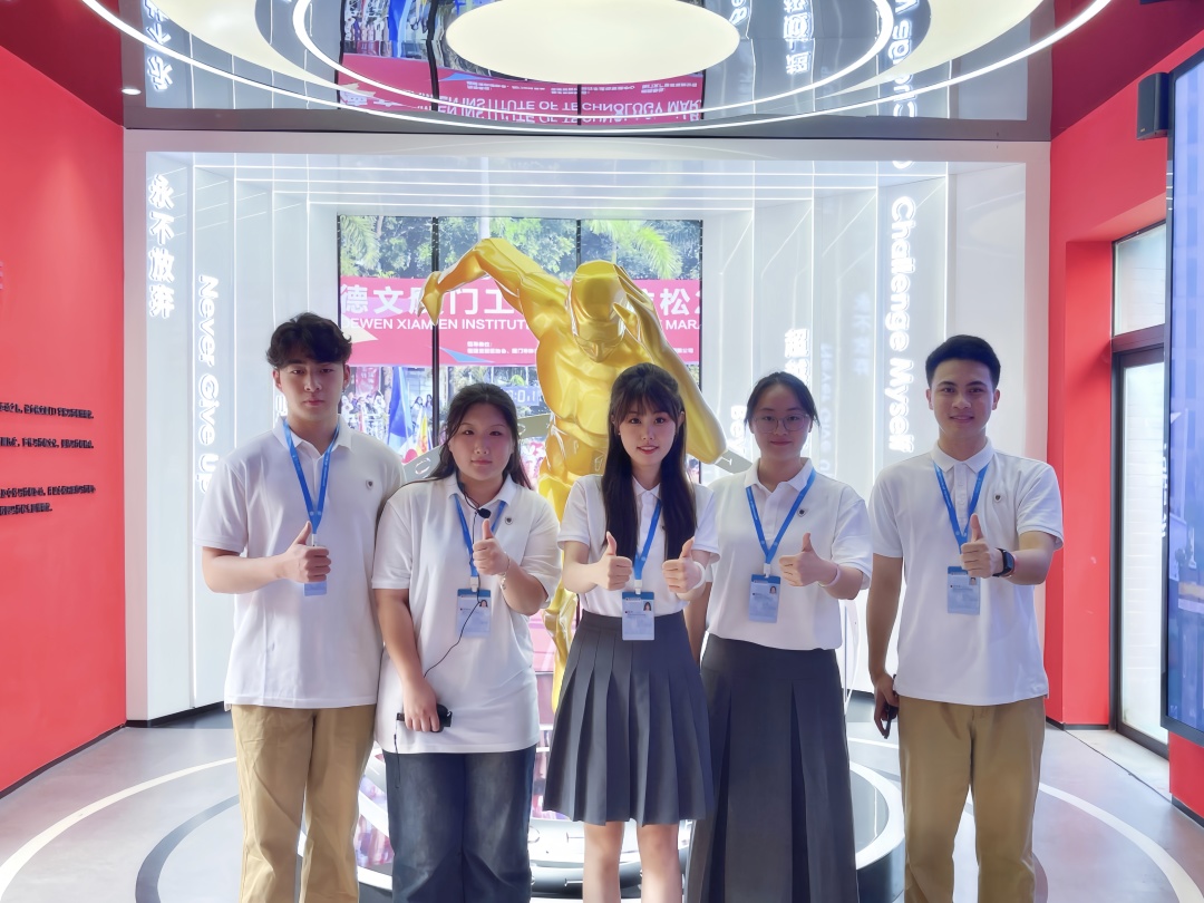 最初讲解时,她紧张到声音发颤,对校园文化一知半解。如今,她能从容应对各类访客,向中外来宾细说厦工故事,更能将商务英语的跨文化理论,转化为与不同国籍访客的心灵对话。某次带领新入职老师们参观校园,用英语与外教畅谈校园文化的瞬间,让她真切体会到了专业与实践融合的力量。老师的指导、伙伴的陪伴、访客的夸奖,共同熔铸成她面对未来的底气,也让她明白:成长从不是孤军奋战,而是在集体温暖中突破自我。