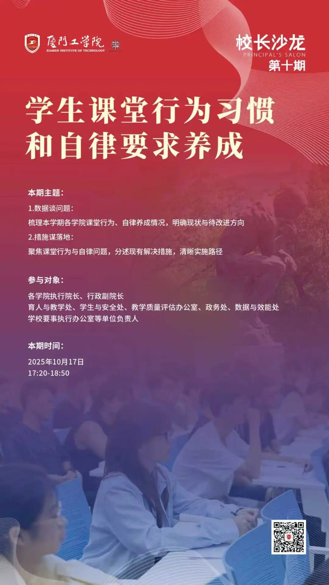 课堂是人才培养的主阵地,高效有序的课堂,需要你我共同创造。为进一步优化学风、提升教学质量,本期校长沙龙聚焦学生课堂行为习惯和自律要求养成,共寻答案,共谋实策!