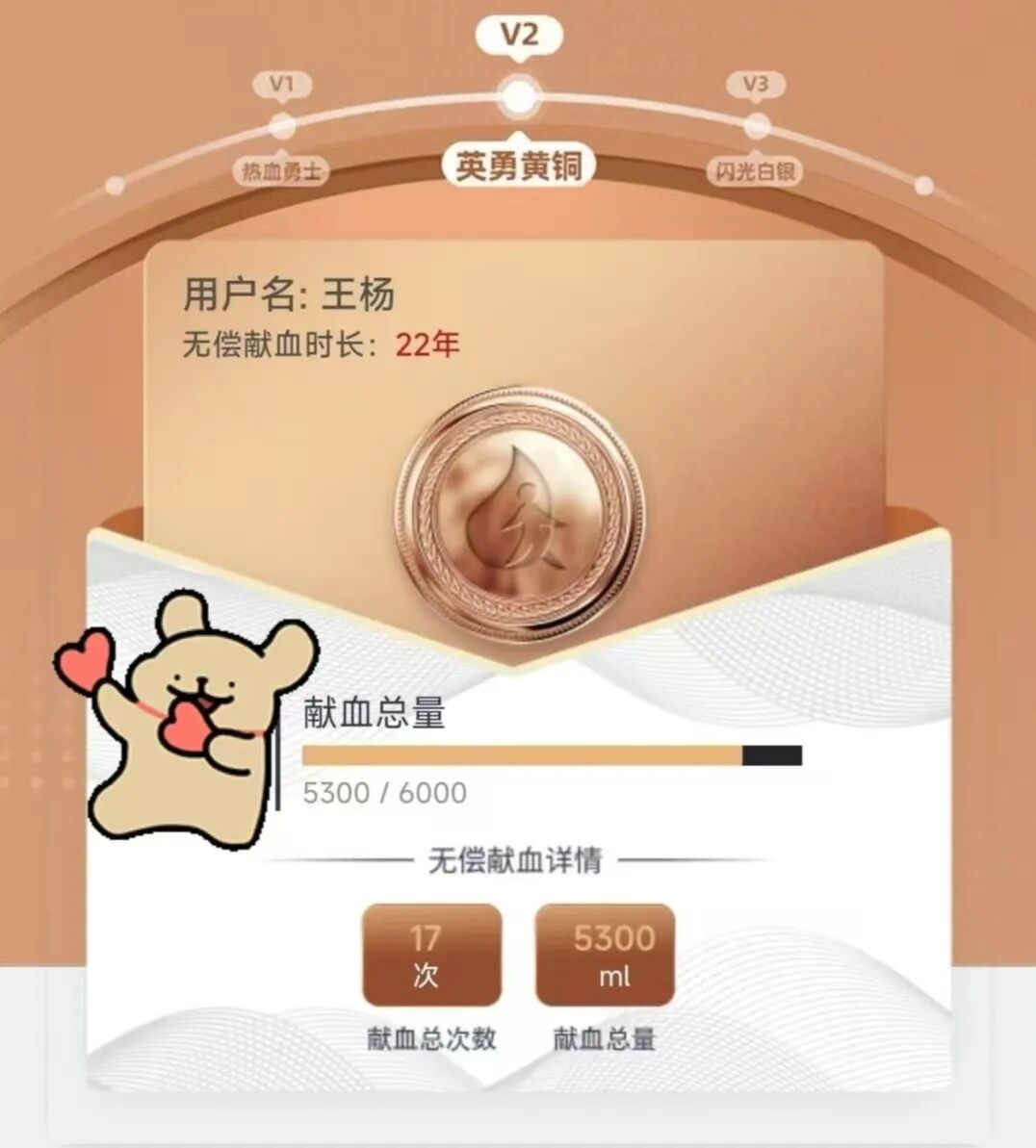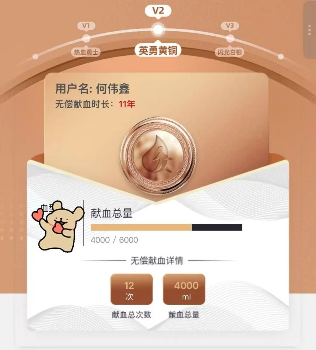 累计献血3次,献血量达1200ml。