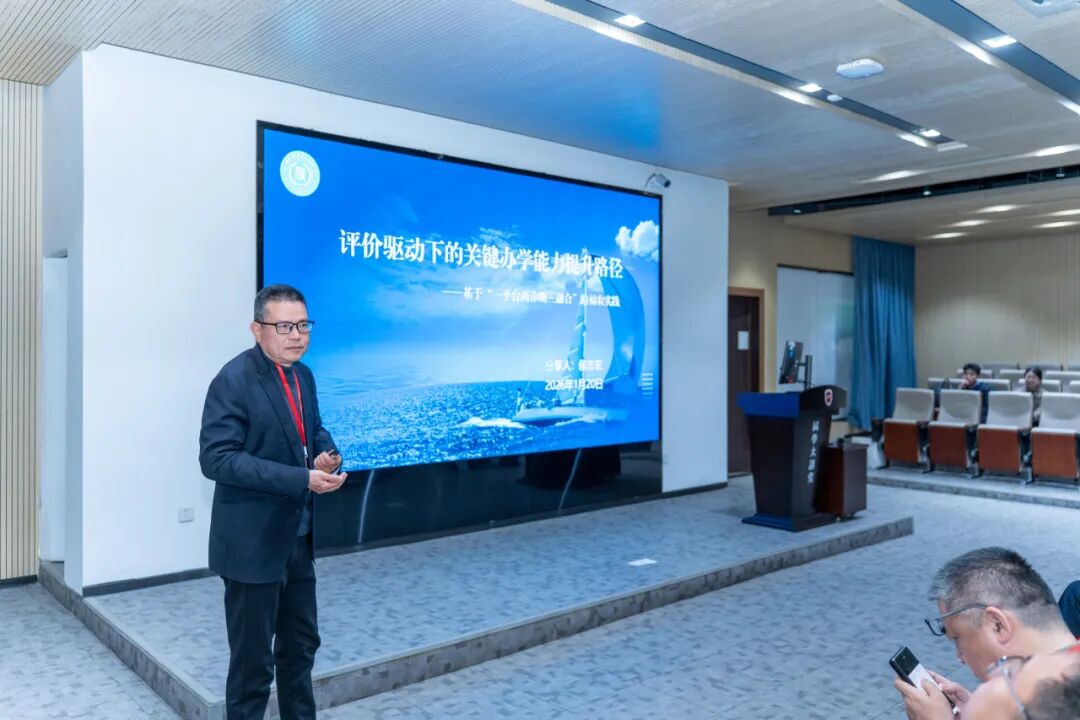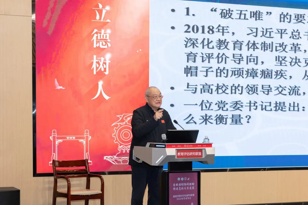 在后续的主题报告环节,中山大学原校长黄达人教授作《关于教育评价改革的一些思考》主题讲座。他结合自身参与教育评估工作的实践经验,系统阐述了新时代教育评价改革的主要趋势与核心观点。他指出,教育评价改革需切实“破五唯”,并将立德树人落实为硬指标。他强调了高校分类评价、基于数据的实证评价以及构建中国自身评价体系的重要性。