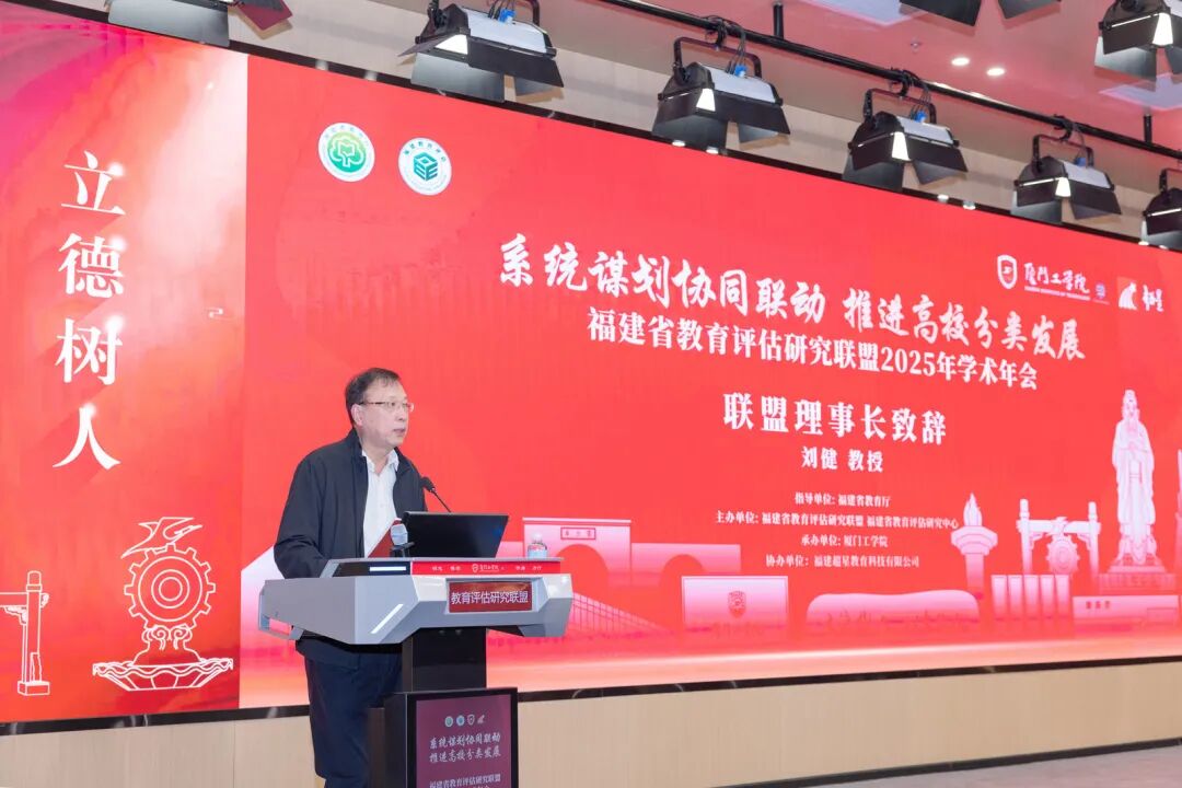 随后,福建省教育评估研究联盟理事长,福建省政协教科卫体委员会副主任刘健教授在致辞中指出,教育评估是教育强省建设的“助推器”,应立足国家战略与区域发展,推动高校实现从“规模扩张”到“内涵提升”、从“同质发展”到“分类卓越”的跨越。当前评估工作仍面临理念滞后、分类引导不足、数字化赋能不够等挑战。未来应深化“教育、科技、人才”一体化评估引导,探索数智赋能评估的新范式,并强化结果运用与专业队伍建设,以高质量评估服务福建教育高质量发展。